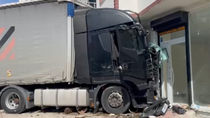 Tekirdağ'ın Çorlu ilçesinde Turhan Göçmen'in kontrolünü yitirdiği Bulgaristan plakalı tır, karşı şeride geçip otomobile, ardından da 5 katlı binanın giriş katındaki boş dükkana çarptı.