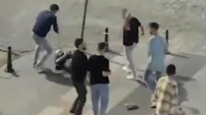 Görüntülerde, kalabalıktan uzaklaştırılan turistin daha sonra yumrukla yere düşürülmesi görülüyor.