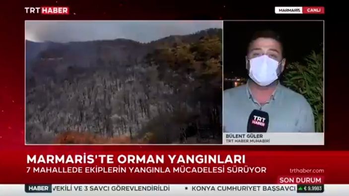 Açıklamada TRT Haber Muhabiri Bülent Güler’in, “Özellikle Turunç Mahallesi, Hisarönü Mahallesi ve Orhaniye Mahallesi'nde yüksek kesimlerde alevler hala etkisini sürdürüyor. Şu an kameraman arkadaşım Ali Güler, Turunç’un üst kesimlerde ve aşağı noktalarda, tepelik alandaki alevlerin hala devam ettiğini ekranlara taşıyor.” sözlerine yer verildi.