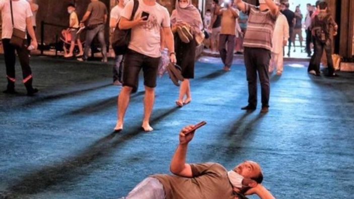 Turistlerle dolup taşan Ayasofya Camii'ne neredeyse herkesin elinde telefon var ve herkes çeşitli fotoğraflarla o anları ölümsüzleştiriyor.