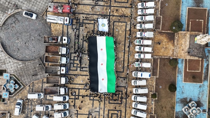 Ayrıca havadan çekilen fotoğrafta, kenti temizlemek için kolları sıvayan gönüllülerin yeni Suriye bayrağı açtığı görüldü.