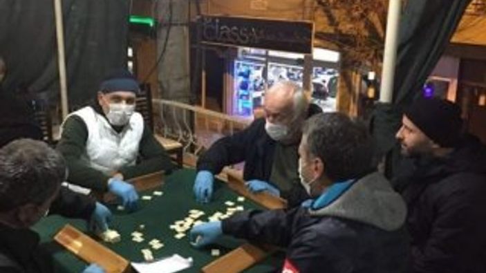 Bursa'nın İznik ilçesinde kahvehanede okey oynayan vatandaşlar, ıstaka ve okey taşlarına dokunmamak için eldiven giydi. Hava ile temas etmemek için de maske taktılar.