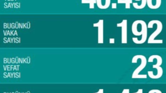 Koronavirüs nedeniyle Türkiye'de bugün 23 kişi daha hayatını kaybetti. Yeni vaka sayısı ise 1192.