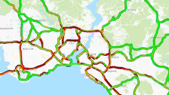 İstanbul Büyükşehir Belediyesi'nin (İBB) trafik yoğunluğu haritasına göre trafik, saat 17.50 itibarıyla yüzde 83 olarak ölçüldü.