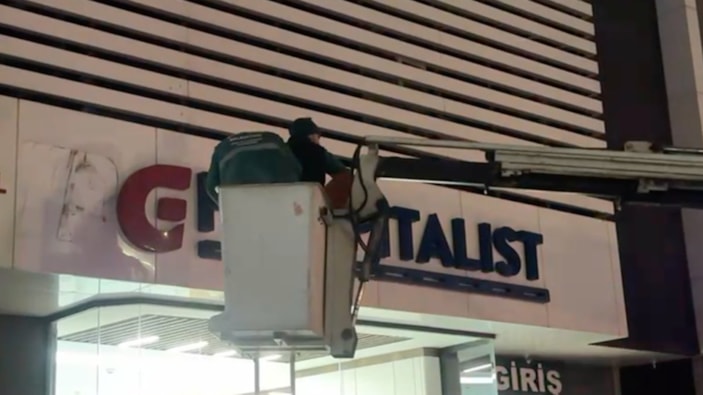 Bu hastanelerden olan TRG Hospitalist Hastanesi'ne tabelasını değiştirmek üzere işçiler geldi.