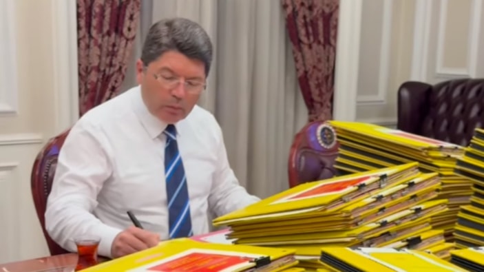 Instagram hesabından paylaşım yapan Bakan Tunç, önündeki dosyaları tek tek inceledi ve gerekli imzaları da attı.