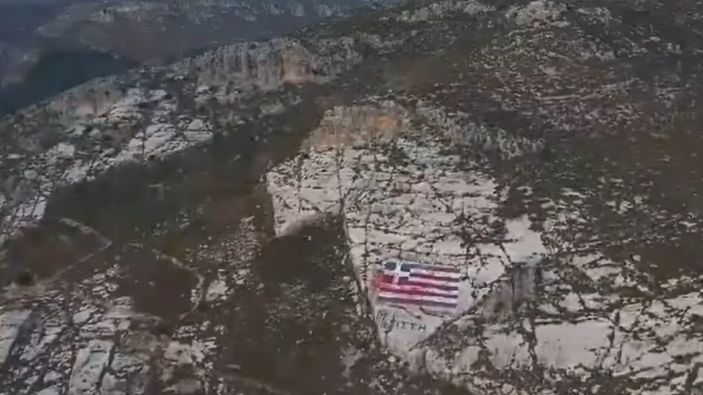 Meis Adası'nın kayalık bir yamacına çizilmiş mavi beyaz Yunanistan bayrağının kırmızıya boyandığına yönelik görüntüler Yunan medyasında yer aldı.