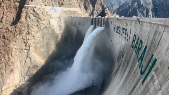 Çoruh Nehri üzerinde inşa edilen, kemer baraj sınıfında 275 metreyle Türkiye’nin birinci, dünyanın beşinci en yüksek barajı olan Yusufeli Barajı ve HES projesinde elektrik üretimi devam ediyor.