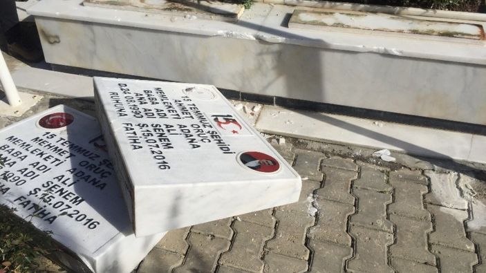 Adana’da 15 Temmuz darbe girişiminde şehit edilen polis memuru ikizler Ahmet ve Mehmet Oruç ile akrabalarının mezar taşları kırılıp tahrip edildi.