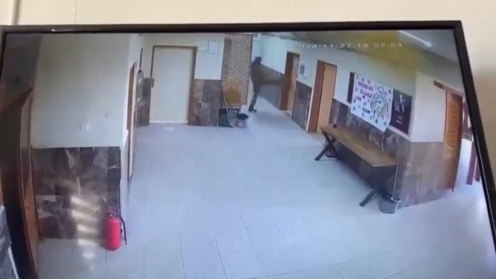 Öğretmenler kendilerini odaya kilitlerken, şahıs kapıyı tekmeleyip öğretmenlere adeta dehşet yaşattı. Şahıs, daha sonra hiçbir şey olmamış gibi okuldan uzaklaştı.