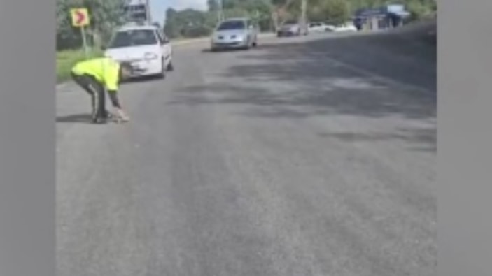 Araçların arasında karşıya geçmeye çalışan kaplumbağanın güvenliği için trafiği kısa süreliğine durduran polis memuru, nazikçe eline aldığı hayvanı yolun karşısındaki ağaçlık alana bıraktı. Bu duyarlı anlar, çevredeki bir kişi tarafından cep telefonu kamerasıyla kaydedildi.