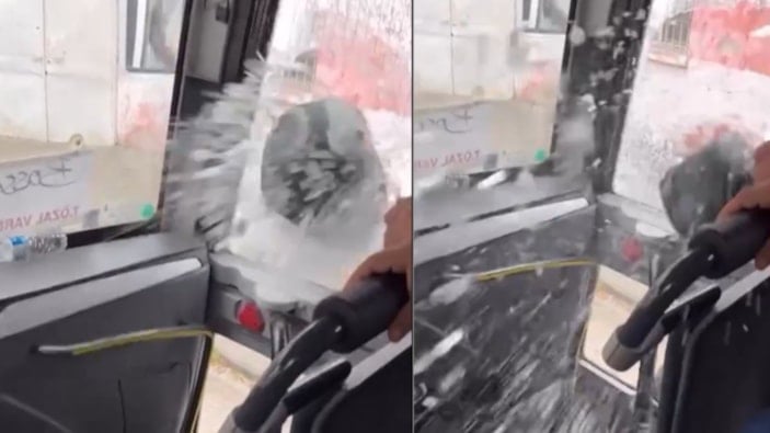 KASKIYLA MİNİBÜSÜN CAMINI KIRDI