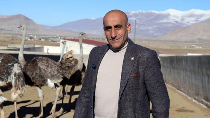 Doğubayazıt ilçesinde yaşayan girişimci İbrahim Akkurt, köyünde kurduğu çiftlikte deve kuşu yetiştiriciliği yapıyor.