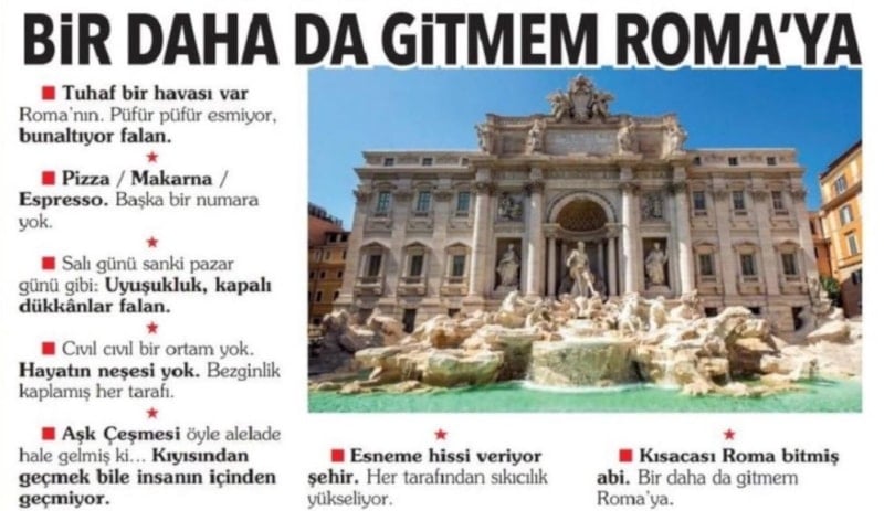 Bezginlik kaplamış her tarafı. Aşk Çeşmesi öyle alelade hale gelmiş ki... Kıyısından geçmek bile insanın içinden geçmiyor. Esneme hissi veriyor şehir. Her tarafından sıkıcılık yükseliyor. Kısacası Roma bitmiş abi. Bir daha da gitmem Roma’ya."