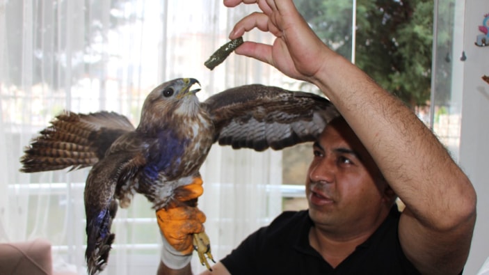 Amasya'da 'bayram misafiri' yaralı şahini et ve yaprak sarmasıyla beslediler