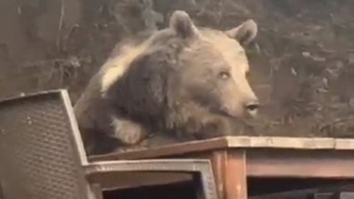 Masaya oturarak adeta servis yapılmasını bekleyen ve masadaki artıkları yiyen ayı, bir süre oturduktan sonra ormanın derinliklerinde kayboldu.