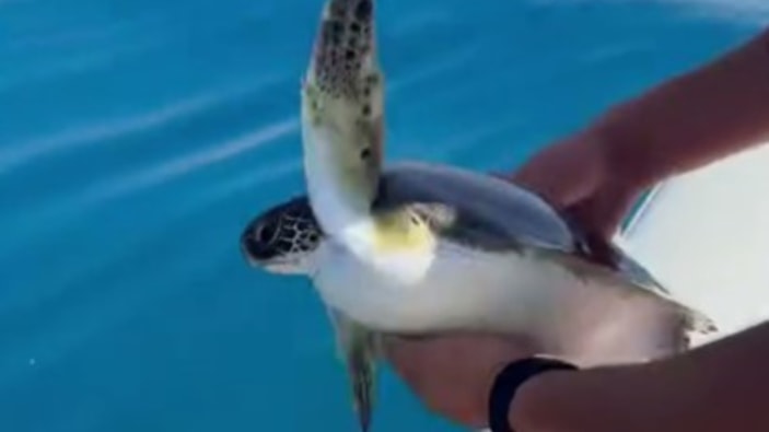 Ardından, özgürlüğüne kavuşan deniz kaplumbağası, balıkçılar tarafından güvenle denize bırakıldı. Balıkçılar, bu kurtarma anlarını cep telefonlarıyla kaydetmeyi ihmal etmedi.