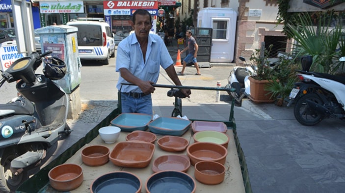 Bol bol videolarını izliyordum. En sonunda bugün Ayvalık sokaklarında kendisine rastladım. Çok mutlu oldum. Şimdi iki tane toprak tepsi satın aldım. Hayırlı müşterileri olsun.