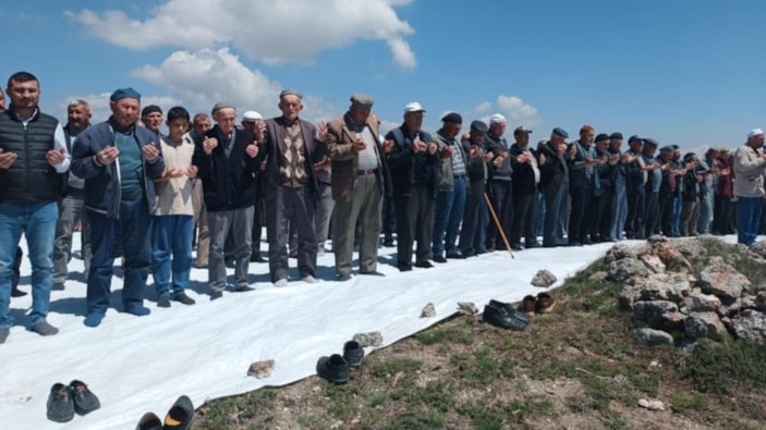 Ankara'nın Beypazarı ilçesinde, kuraklık nedeniyle tarlaları susuz kalan ve mahsullerinin zarar görmesinden endişe eden köylüler, geleneksel bir şekilde yağmur duası için bir araya geldi. Köy mezarlığı yakınlarında yapılan dua etkinliğinde, vatandaşlar ellerini semaya açarak yağmurun bereketiyle doğanın canlanmasını diledi.