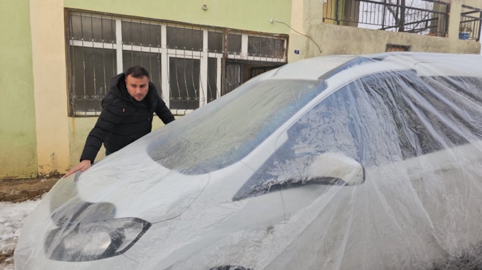 Soğuk havaların etkili olduğu ve hayatın olumsuz etkilendiği kentte, vatandaşlar araçlarını soğuktan korumak için naylon brandalarla örtüyor.