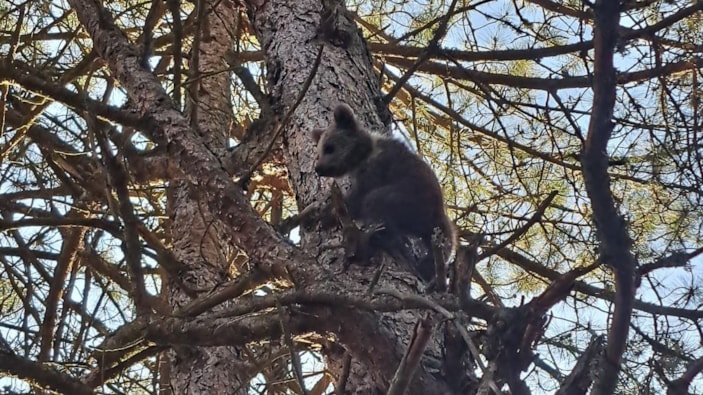 Köy muhtarı ağaçta mahsur kalan yavru ayıyı Doğa Koruma ve Milli Parklar yetkililerine bildirdi.