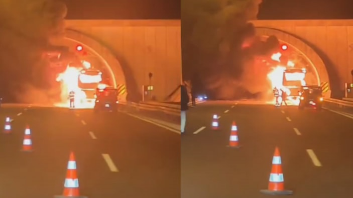 Kocaeli'den İzmir istikametine giden yolcu otobüsü, Bursa-İstanbul yolu Orhangazi Tüneli girişinde alev alev yandı.. 35 yolcu hızla tahliye edilirken, 2 yolcu dumandan etkilendi.