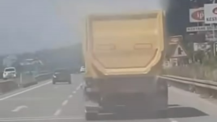 Bu şekilde trafiğe çıkan kamyon, arkasındaki araçların hayatlarını tehlikeye attı.