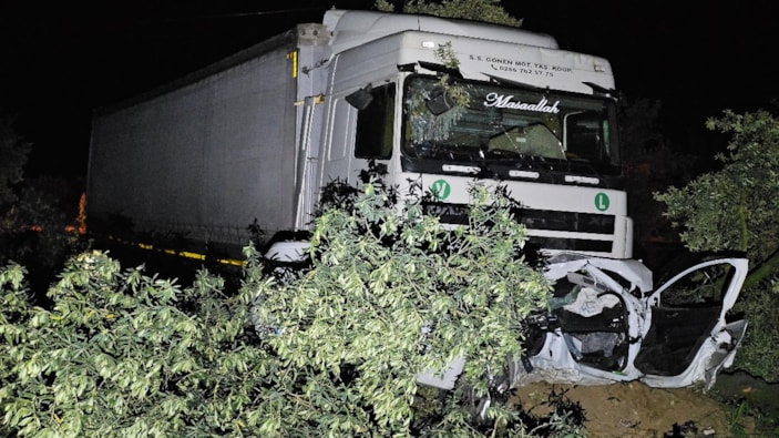 Altına aldığı otomobili metrelerce sürükleyen tır yoldan çıkıp zeytin bahçesine girdi. Ağaçları parçalayan tır, yaklaşık 50 metre sonra durabildi.