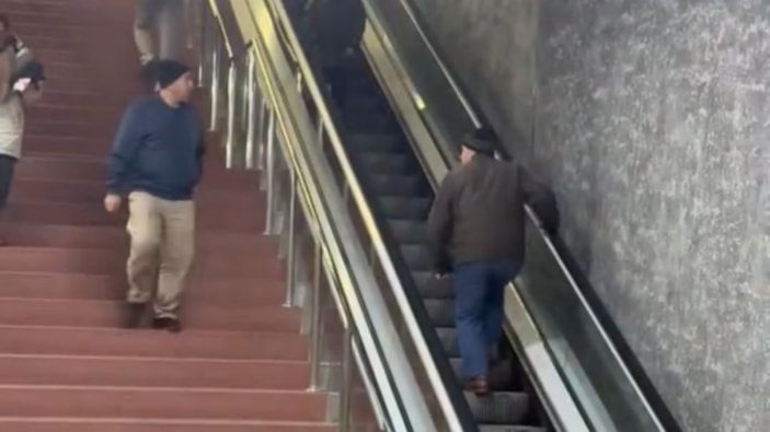 Fakat bindikten bir süre sonra çalışan yürüyen merdivenler aşağı yönde hareket edince mağdur olan vatandaş, dakikalarca ters bindiği yürüyen merdivenden yukarı çıkmak için uğraştı.