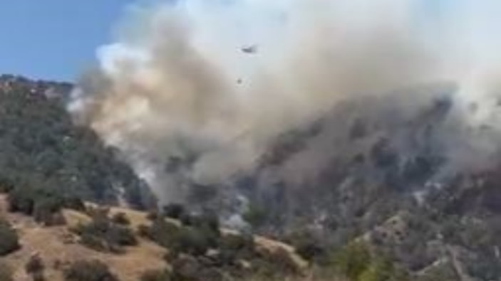 Zor şartlarda görev yapan yangın söndürme ekipleri, sarp arazide yangını söndürmek için çalışmalarını devam ediyor.