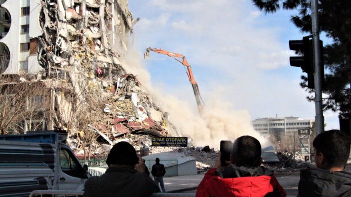 Galeria Sitesi'nin kontrollü yıkımı sırasında bir bloğu daha çökerken, ayakta kalan 2 bloğun yıkım işlemleri sürüyor. Diyarbakırlılar ise anılarla dolu AVM'nin yıkımını hüzünle seyredip, cep telefonu ile görüntü çekiyor.