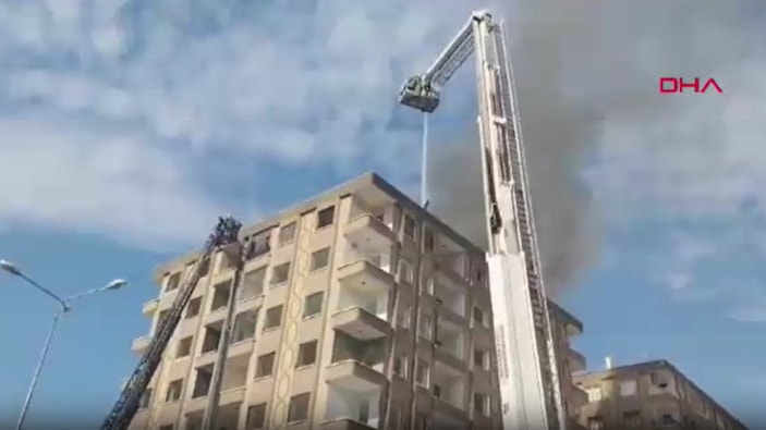 Kahramanmaraş merkezli 6 Şubat 2023’teki depremde ağır hasar görerek boşaltılan Bağlar ilçesi Turgut Özal Bulvarı üzerindeki 7 katlı binanın çatısında, öğle saatlerinde henüz bilinmeyen bir nedenle yangın çıktı.