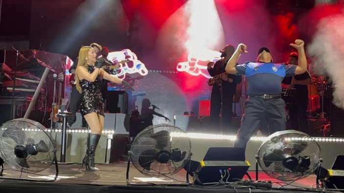 Sanatçı Derya Uluğ'un sahnesinde zabıta kıyafetiyle dans eden memurun hareketleri izleyenlere keyifli anlar yaşattı.
