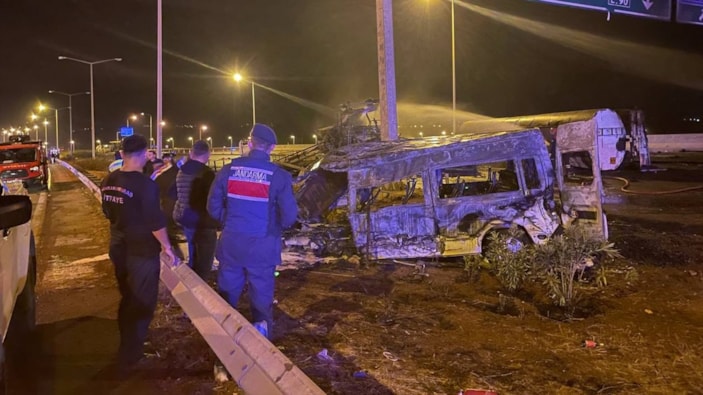 Kontrolden çıkan tır, önce önündeki minibüse çarparak savurdu daha sonrasında ise yol asfalt çalışması yapan karayolları ekiplerinin arasına dalarak devrilerek alev aldı.