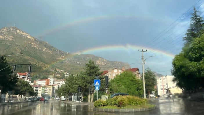 Yağmurun ardından ortaya çıkan güneş gökyüzünde gökkuşağı oluşmasına neden olurken gökyüzünün güzelliklerinden olan gökkuşağını gören vatandaşlar cep telefonuna sarılarak bu anı ölümsüzleştirdi.