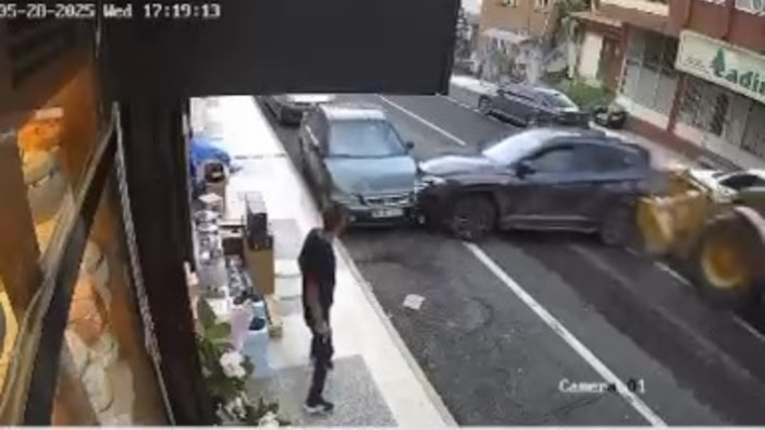 Hatay'da freni arızalanan kepçe sürücüsünün kontrolünden çıkarak park halindeki ve trafikteki 4 araca çarptı. Kepçe sürücüsü hafif şekilde yaralanırken, kaza anı kameraya yansıdı.
