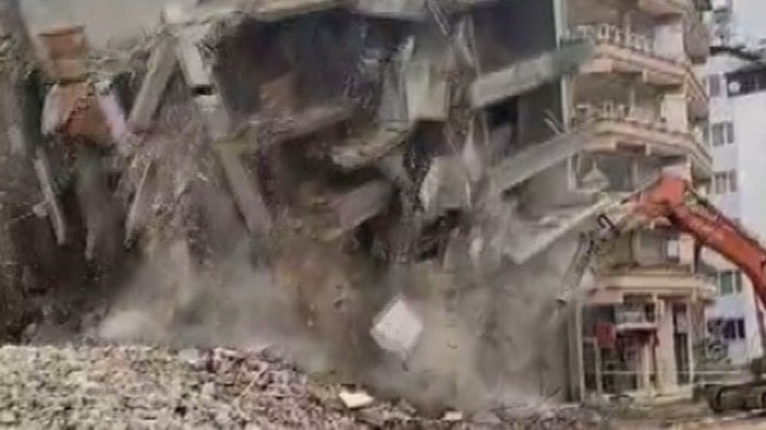 Defne ilçesinde ağır hasarlı olan 5 katlı bina, mahkeme sürecinin tamamlanmasının ardından, iş makinesinin darbesiyle yerle bir oldu. O anlar ise cep telefonu kamerasına yansıdı.
