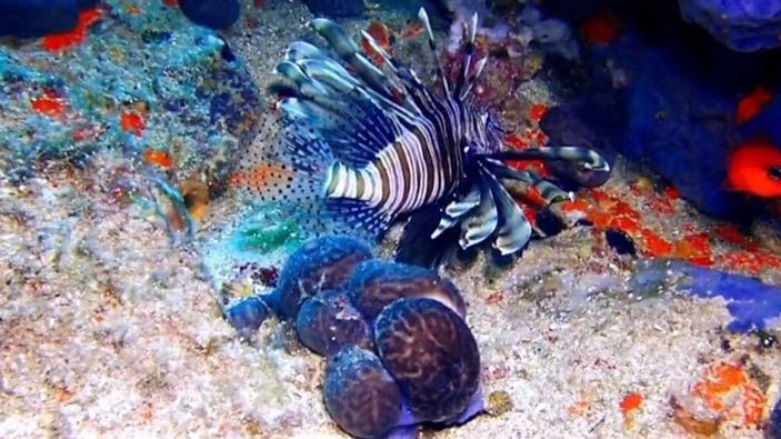 Balıkesir’in Ayvalık ilçesinde, dikenleri zehirli ve istilacı bir tür olan aslan balığı görüntülendi. 12 metre derinlikte görüntülenen balığın bilinçli bir şekilde avlandığında ekonomik bir değer taşıdığı belirtildi.