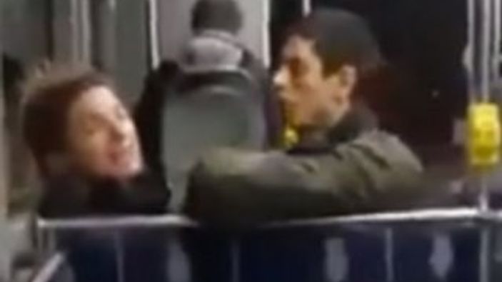 Öpüşen çifti gören yolcular, tepki gösterdi. Kısa sürede alevlenen tartışma kameralara yansıdı.