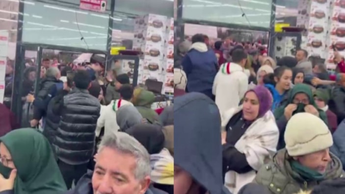 Vatandaşların birbirlerini iterek alışveriş yapmaya çalıştığının yer aldığı görüntülerde, mağaza görevlilerinin ‘yavaş yavaş, adamı ezdiniz’ diyerek uyarıda bulunduğu duyuluyor.