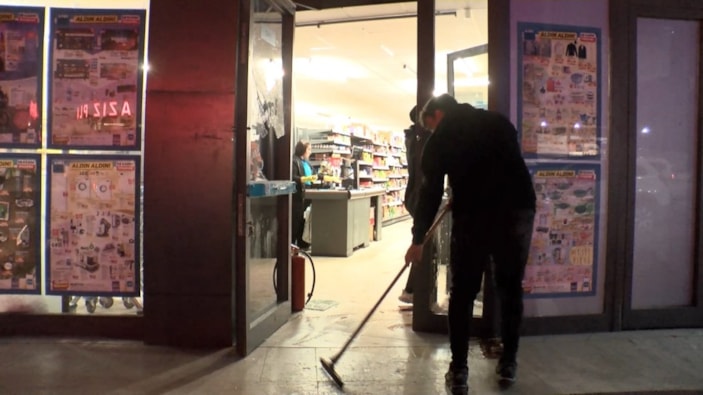 Aynı caddede bulunan fırının çalışanı ise, "İçeride hırsızlık yapıyorlarmış. Bununla ilgilide çalışanlar yakalamışlar bunları sonra da tartışma çıkmış. Çalışanlara saldırmışlar onlar da kapıyı kilitlemişler. Yangın tüpü ile camı kırmışlar camı. Polisler de yakalamışlar" ifadeleriyle olayı anlattı.