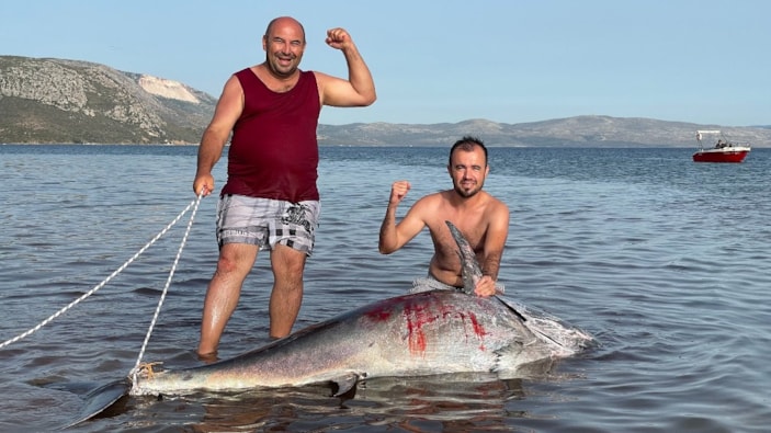 İzmir'de 200 kiloluk orkinosu çakı ve zıpkın ile avladılar