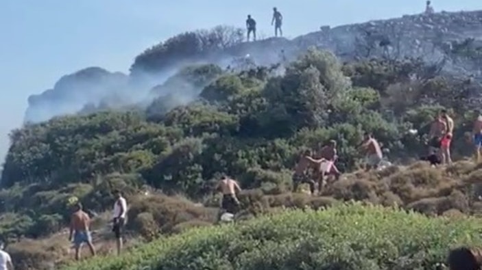 Yangına koyda bulunan tatilciler müdahale etti. Vatandaşların imece usulü denizden kovalarla su taşıyarak yangına müdahale ettiği görüntüler cep telefonuyla kaydedildi.
