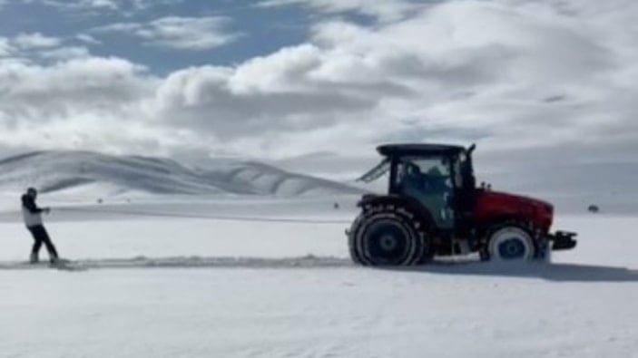 Köy içinde ve çevresinde traktörün arkasına bağladığı snowboard ile dolaşan Gök, fazla aktivenin bulunmadığı köylerinde kar yağışını fırsata çevirdiklerini söyledi.