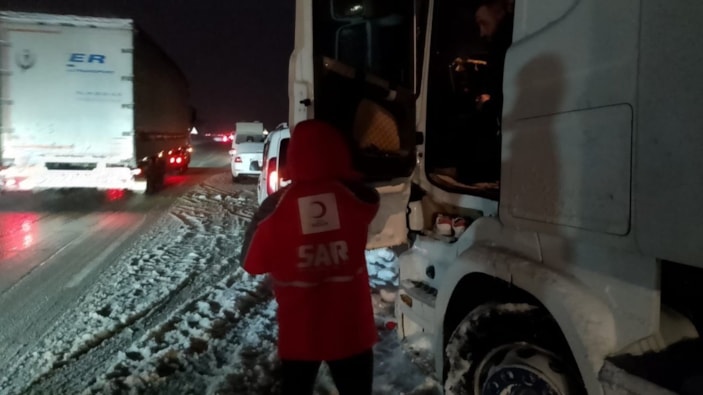 Samsun-Ankara karayolunda etkili olan yoğun kar yağışı nedeniyle yolda mahsur kalan vatandaşlara, Samsun Kızılay ekipleri ikramlarda bulunarak destek sağladı.