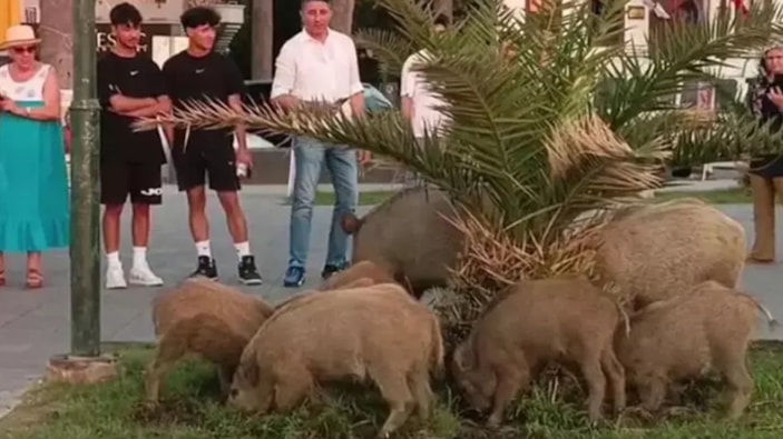Kuşadası ilçesinde ormanlık alandan çıktığı tahmin edilen yetişkin yaban domuzları ve yavruları, dün akşam saatlerinde ilçe merkezinde bulunan Atatürk Meydanı’na geldi.