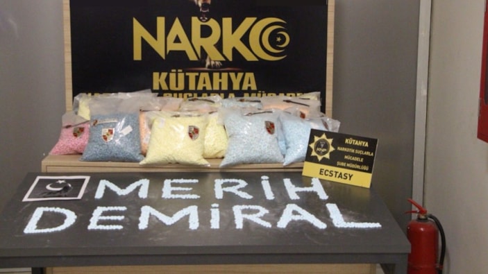 Bu arada emniyet güçlerince 64 kilo 890 gram ecstasy maddesinin sergilendiği standa, UEFA tarafından Bozkurt işareti yaptığı gerekçesiyle 2 maç ceza verilen milli futbolcu Merih Demiral’in isminin yazılması dikkat çekti.
