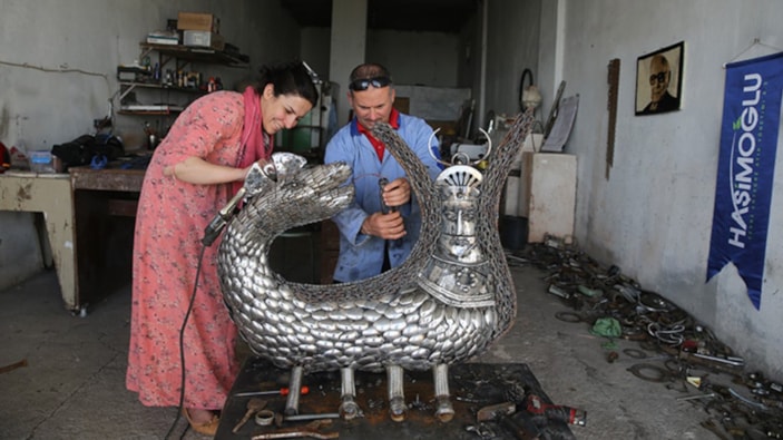 Agrin Çakmak ise eşiyle son dönemde atıklardan heykel yapmaya başladıklarını, güzel eserler ortaya çıktığında bu alana ilgilerinin daha da arttığını belirtti.