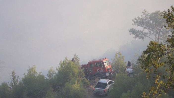 Çam ağaçlarının yoğunlukta olduğu bölgede yükselen alevler, rüzgarın etkisiyle kısa sürede yayılmıştı.