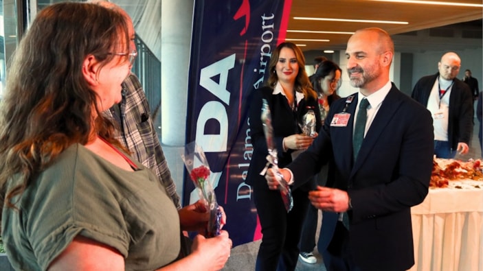 Havalimanı yetkilileri, 149 kişilik turist grubunu coşkuyla karşılarken, her bir yolcuya geleneksel olarak çiçek takdim edildi.